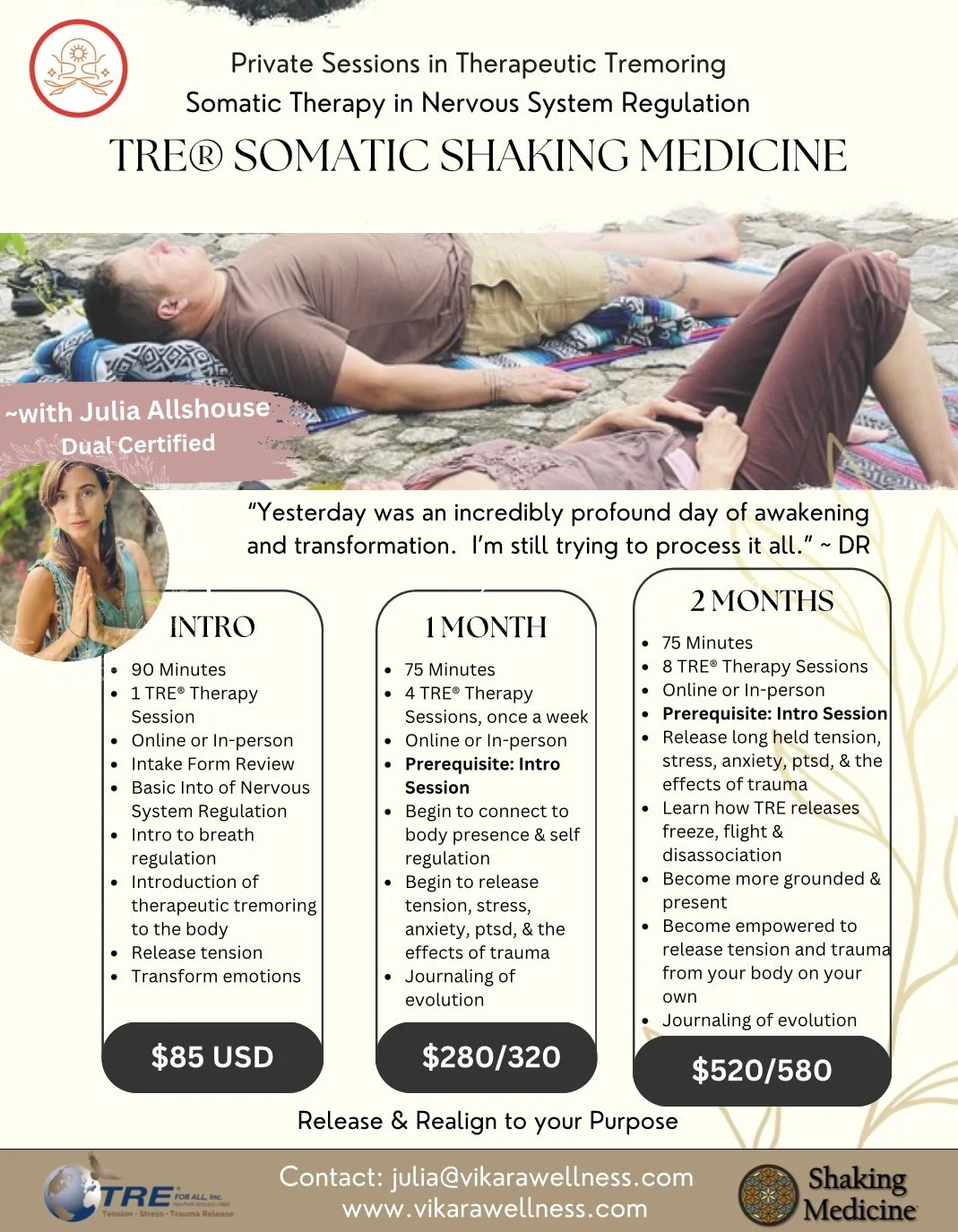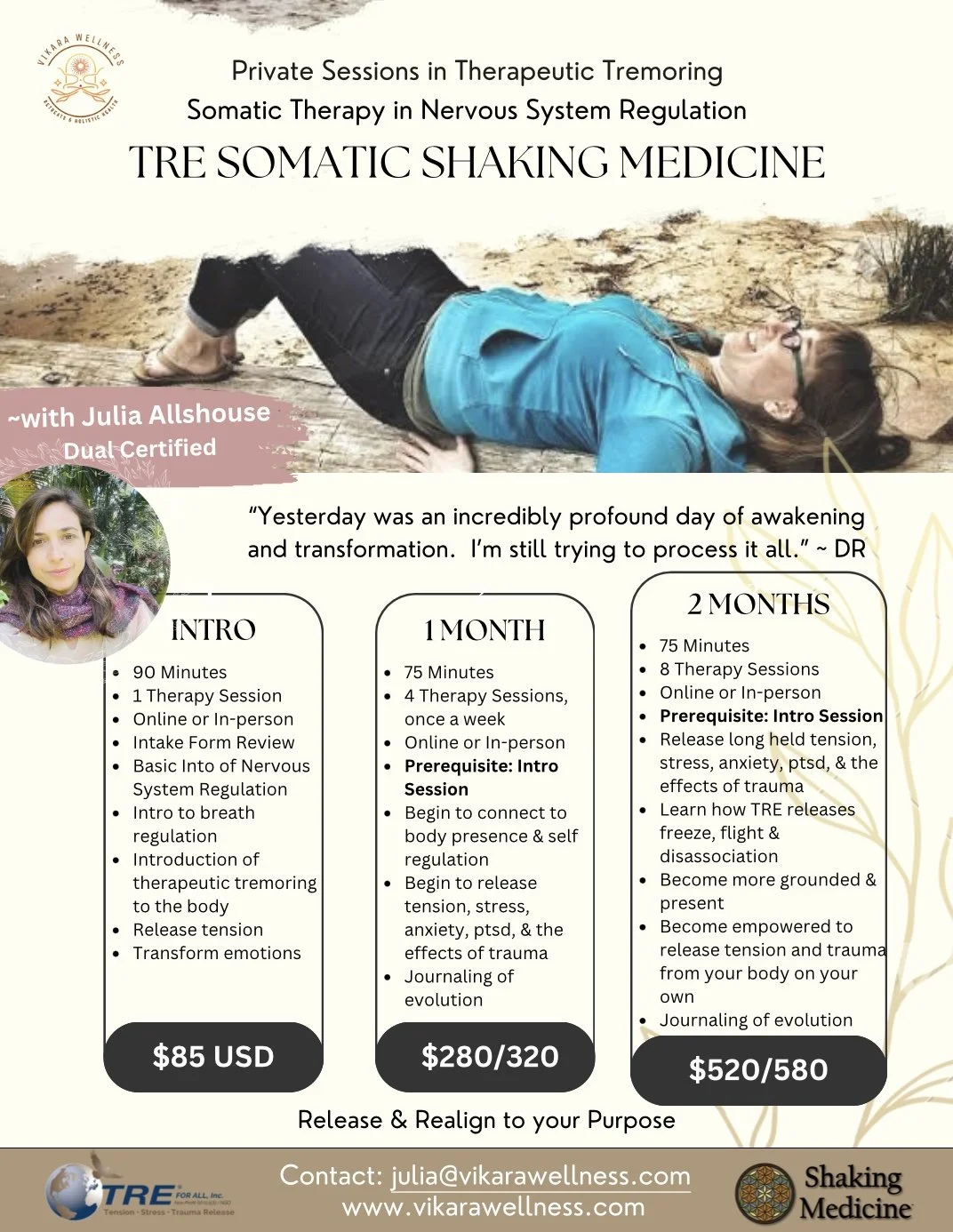 Your sessions will be lead by a dual certified TRE® (Tension & Trauma Release Exercises) & Shaking Medicine embodiment teacher online or in-person. This is a very successful embodiment practice on-line, so don’t let distance create any doubt.
